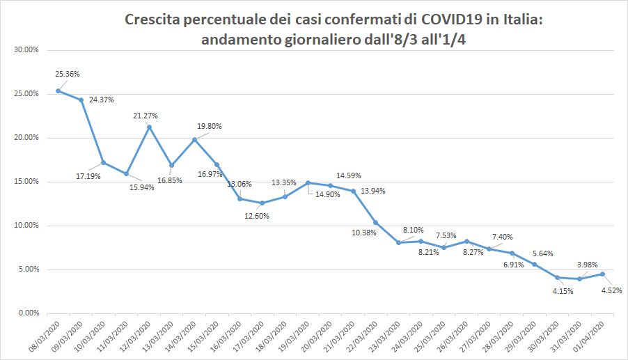 Qui spiego le ragioni per cui è utile un grafico che rappresenti l’andamento della crescita percentuale dei casi confermati totali di coronavirus. In particolare confronto tale grafico con uno che rappresenti gli incrementi assoluti, discuto dei confronti tra paesi e ragiono sui tempi di raddoppio dei casi totali.